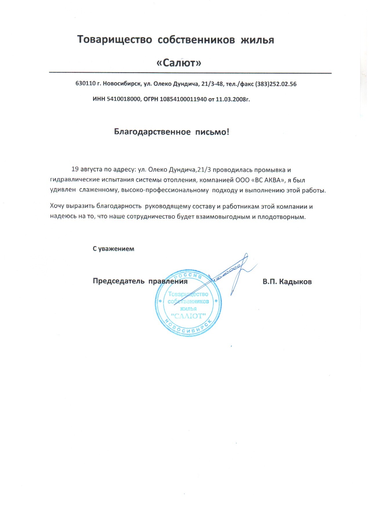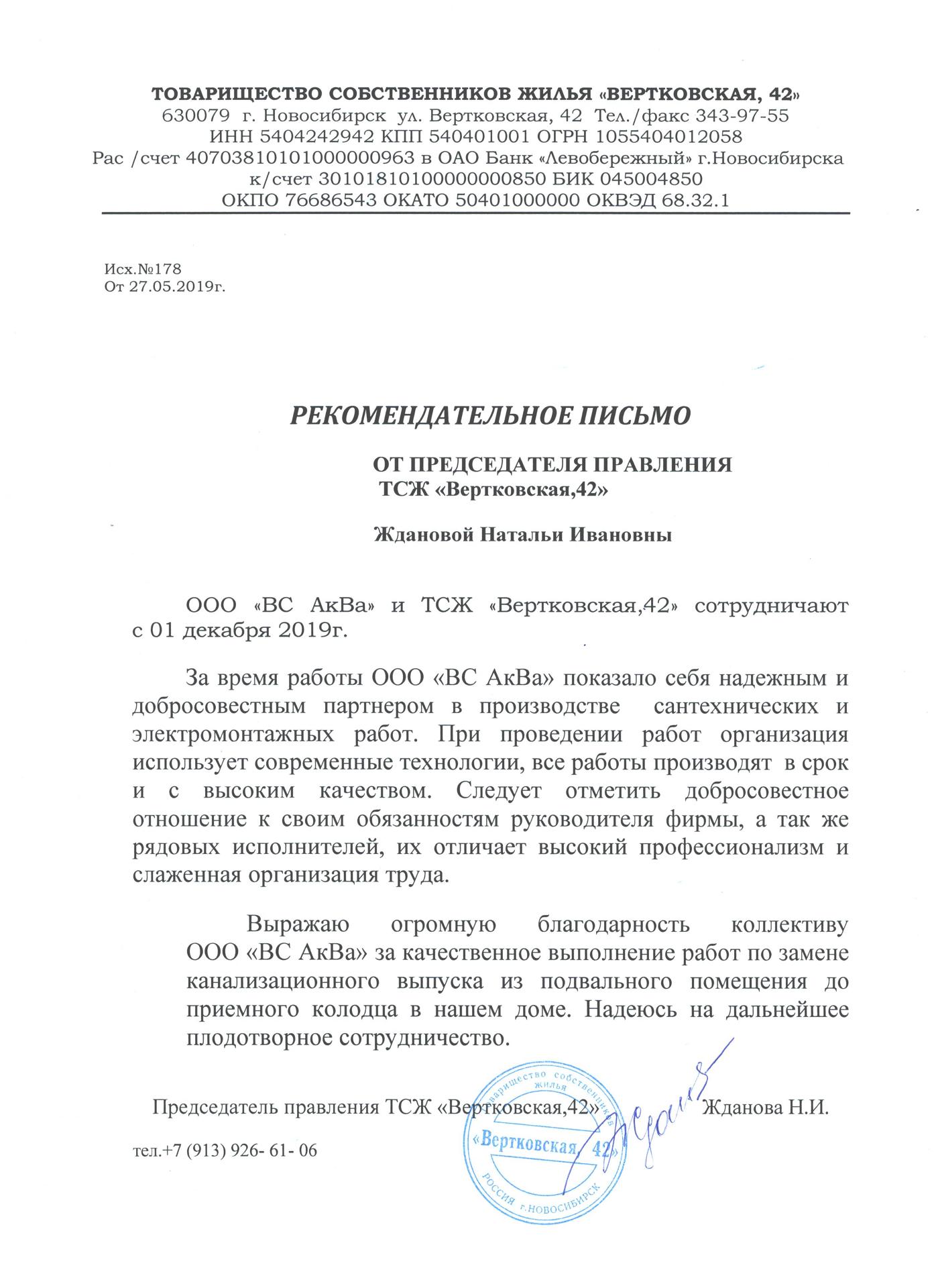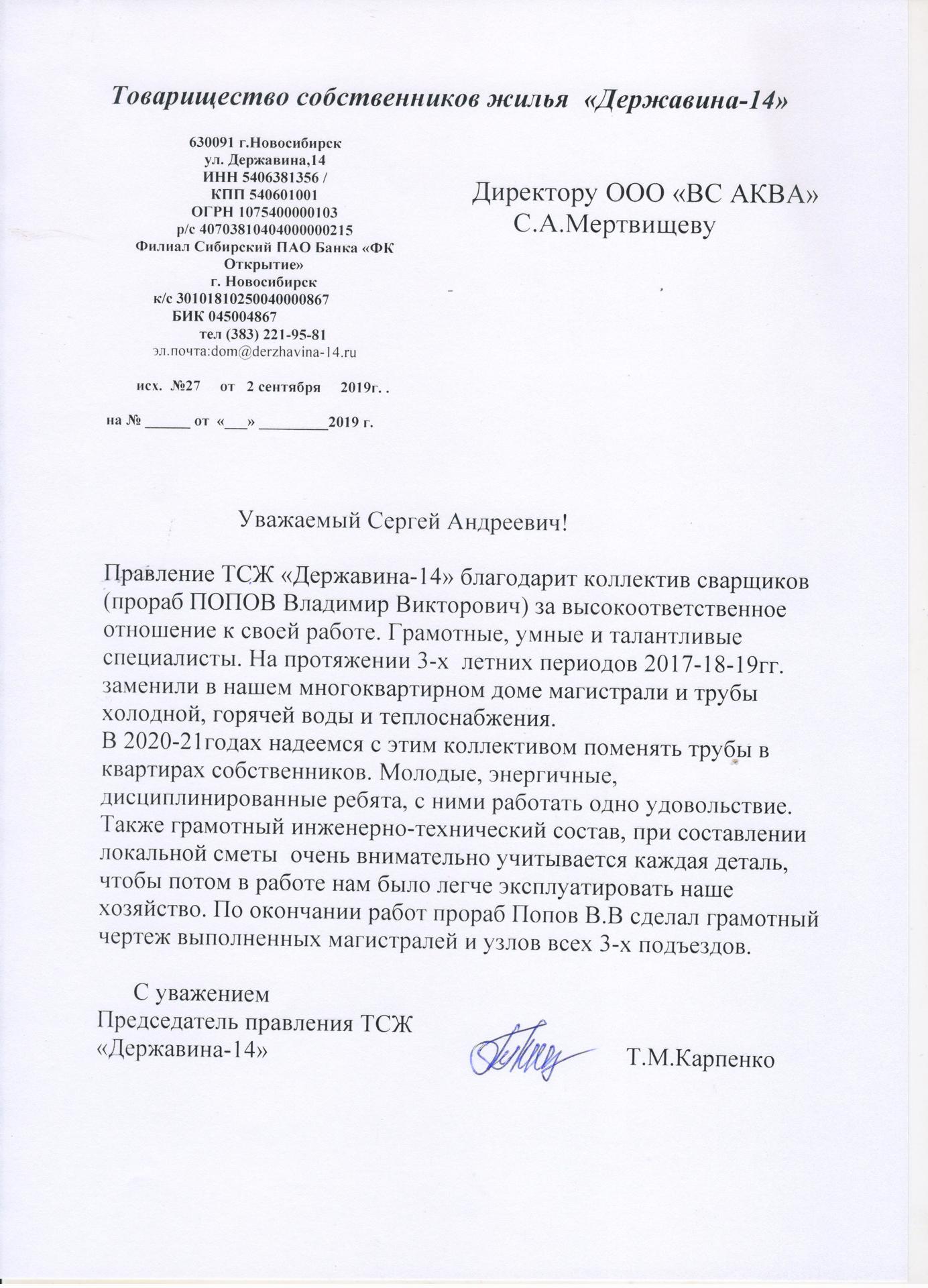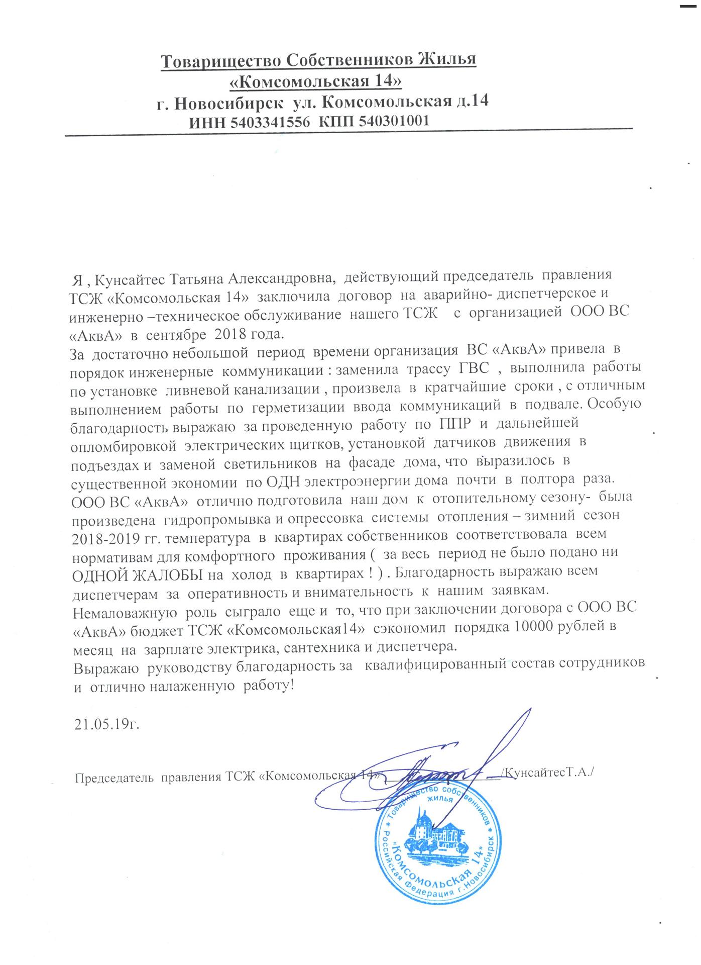 Товарищество собственников жилья «Высоцкого 11» выражает благодарность компании ООО «ВС АквА» за проведение капитального ремонта систем горячего и холодного водоснабжения и текущий ремонт канализационной системы. Хотим отметить Ваш профессионализм, умение действовать согласно договору и стремление выполнять работу в соответствии с требованиями заказчика. Нам было приятно сотрудничать с Вами и с Вашими подчинёнными.